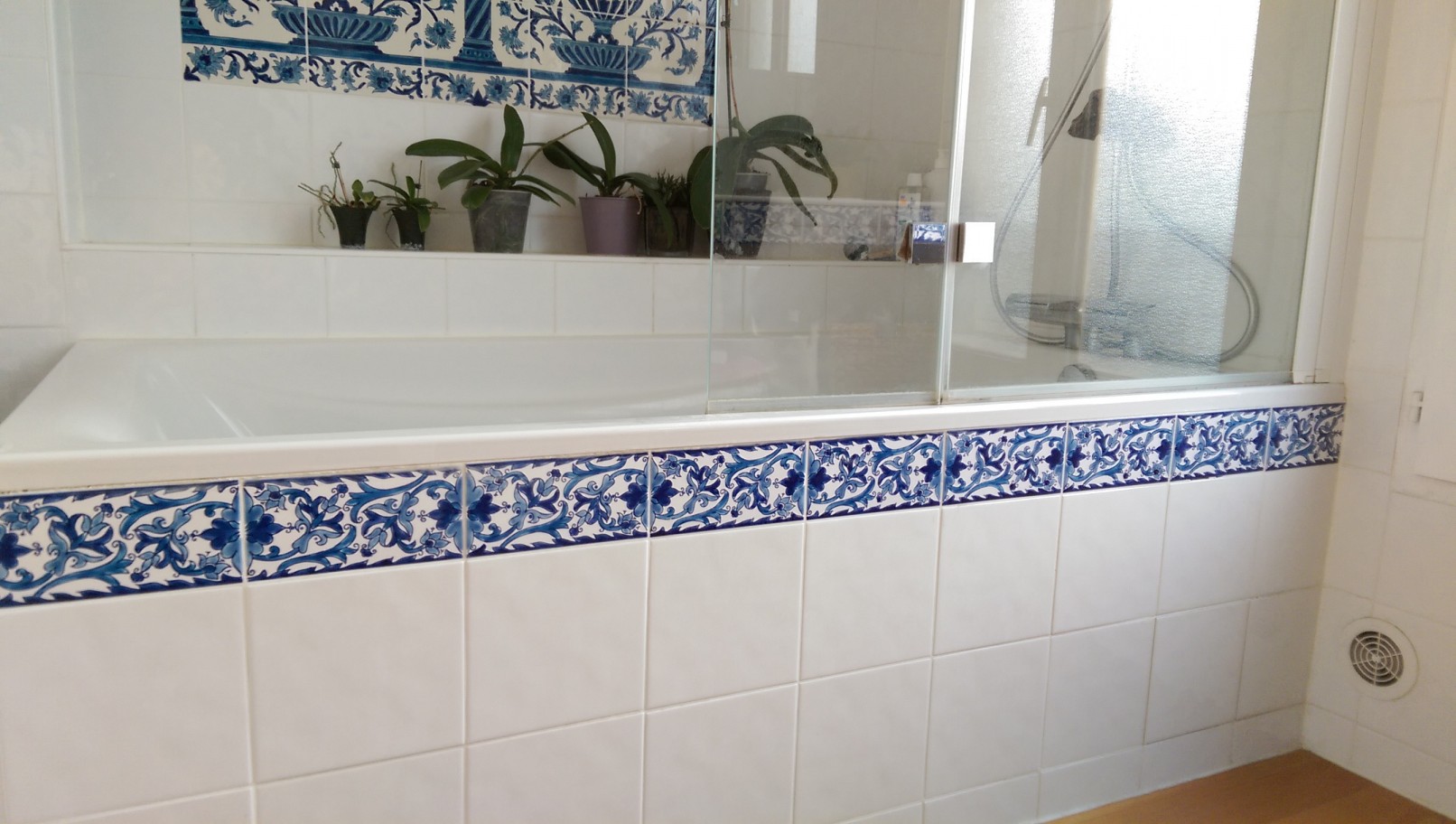 Une base de blanc, pour faire vivre le frises magnifiques de chez Doremail, une fresques au dessus de la baignoire pour habiller le mur blanc, et un sol en carrelage faux parquet pour apporter du cachet.